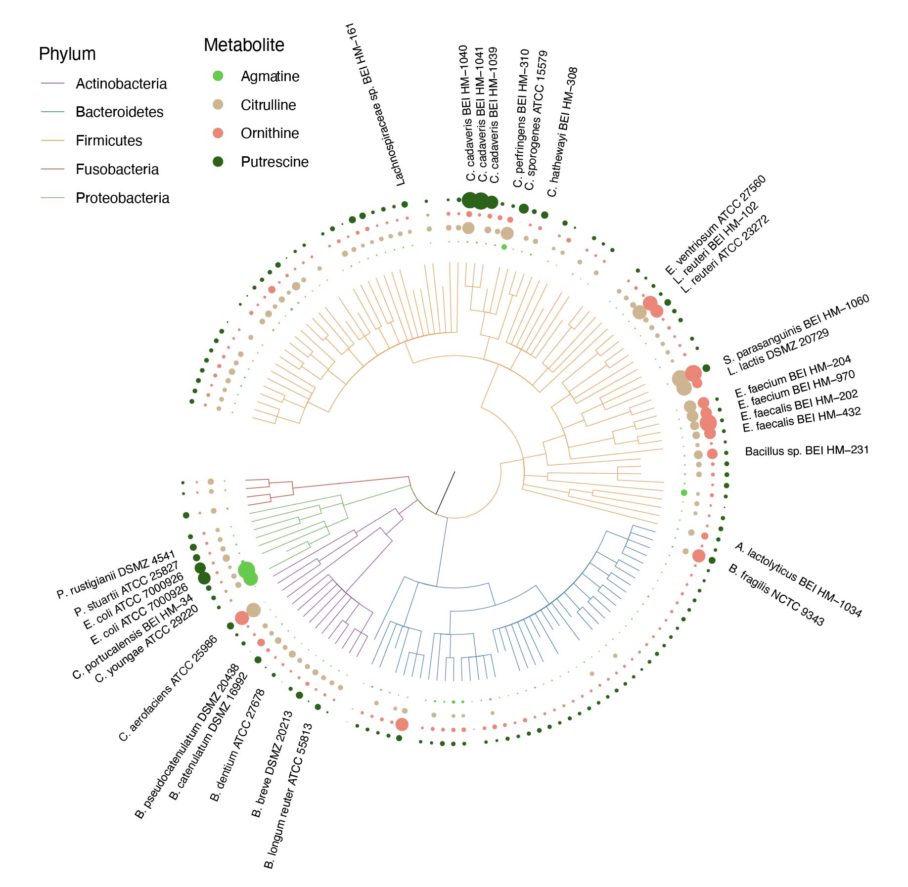 A phylogenetic tree constructed using NCBI taxonomy IDs, with branches color-coded by phyla. It profiles the metabolite biosynthetic abundance for individual bacterial strains in the gut microbiome.
